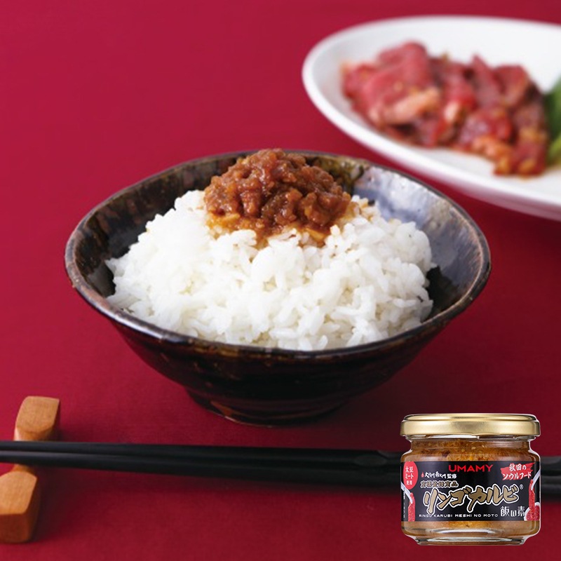 <リンゴカルビ飯の素>『リンゴカルビ飯の素』は、秋田県内に5店舗を展開する「焼肉大同門・南大門」の看板メニューである「リンゴカルビ®」をイメージして作ったご飯のお供商品です。