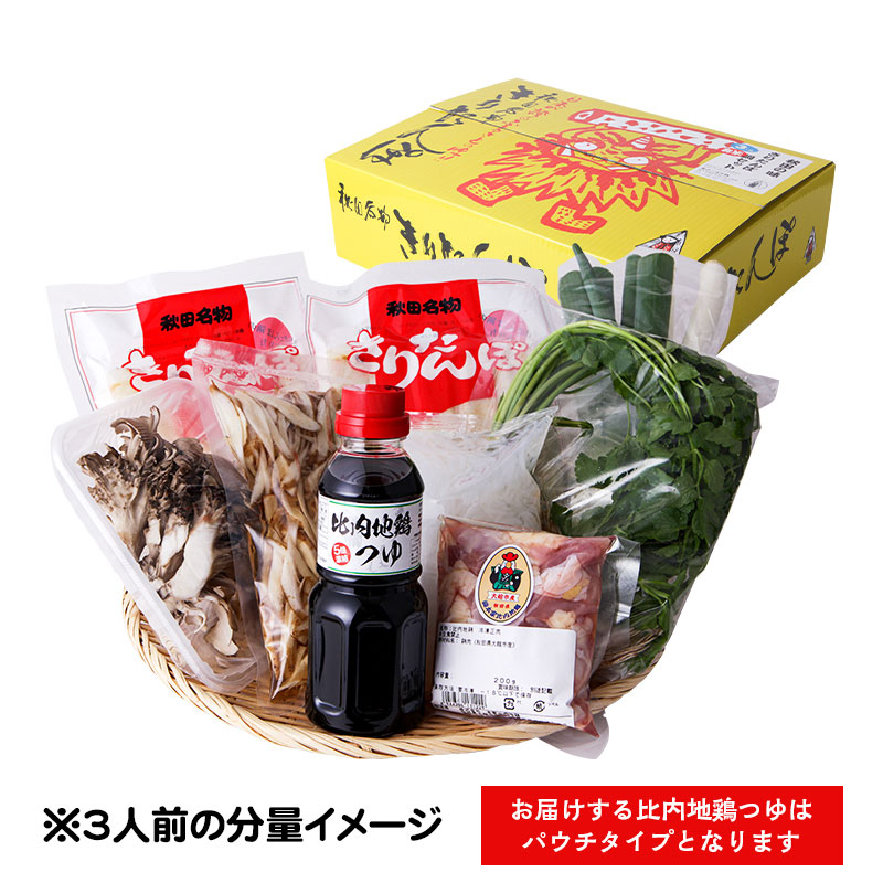 | 内容量 | きりたんぽ 5本(1本60g)、比内地鶏スープ(200ml)、比内地鶏(100g)、ネギ 1本、セリ 半束、まいたけ 1パック、ごぼう 1袋、糸こん 1袋 |