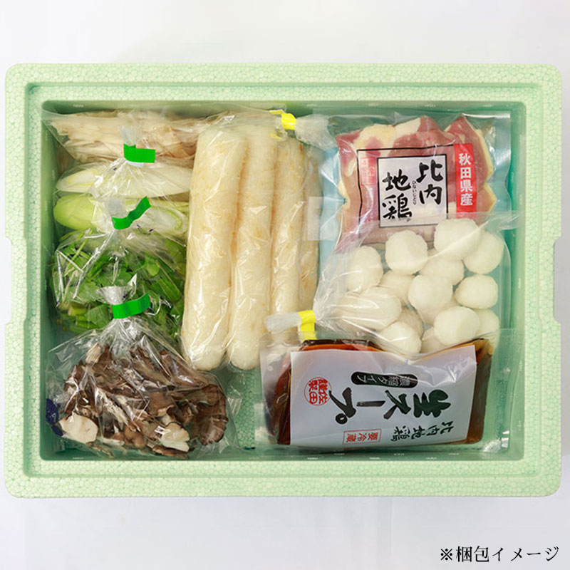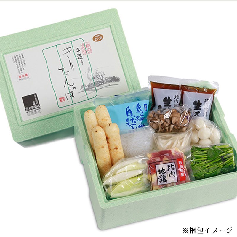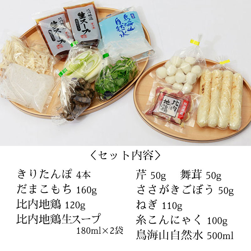 | 原材料 | きりたんぽ:うるち米(秋田県産)、食塩 だまこもち:うるち米(秋田県産)、食塩 鍋つゆ:しょうゆ(本醸造)(国内製造)、鶏ガラ、みりん、日本酒、ごぼう、ねぎ、砂糖、煮干し/調味料(アミノ酸等) 他具材:鶏肉(秋田県産、比内地鶏)、ねぎ(国産)、芹(国産)、舞茸(国産)、ごぼう(国産)、糸こんにゃく(国産こんにゃく粉、水酸化カルシウム)ナチュラルウォター(秋田県製造) |