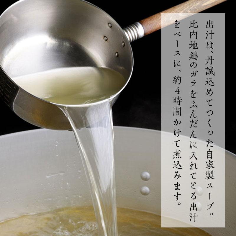 出汁は、丹誠込めてつくった自家製スープ。比内地鶏のガラをふんだんに入れてとる出汁をベースに、約4時間かけて煮込みます。