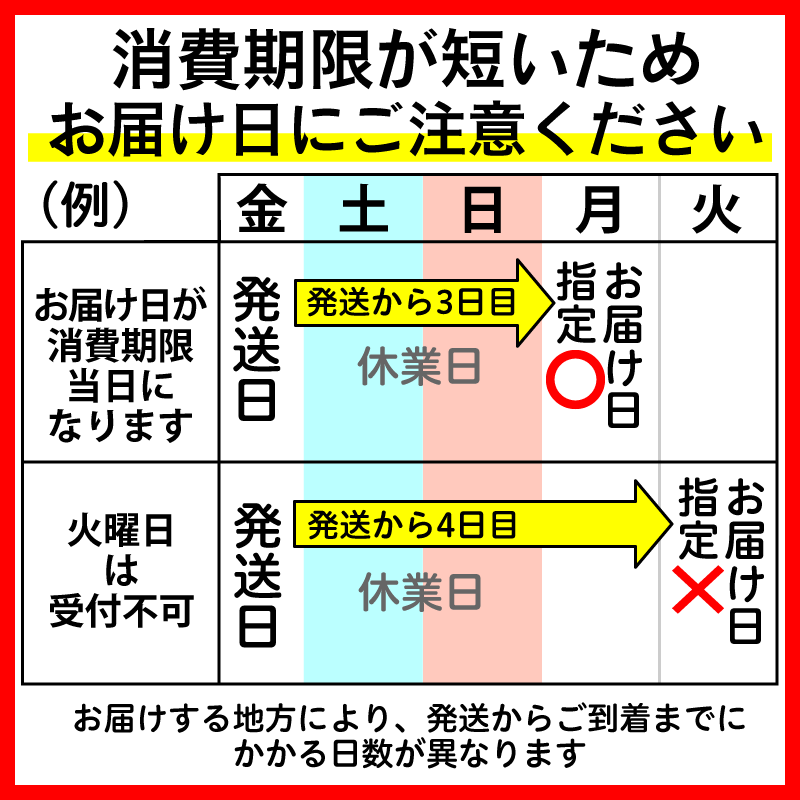 【必須】平日発送のみのため、賞味期限の都合上、配送希望日を承ることができない場合があります。