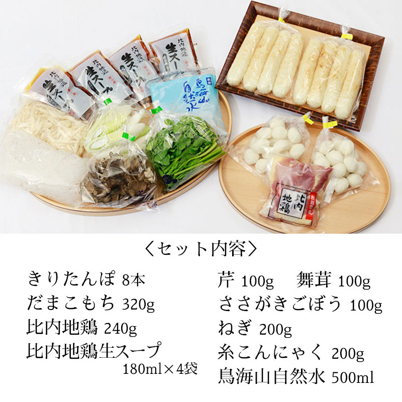 | 原材料 | きりたんぽ、だまこもち:うるち米(秋田県産)、食塩 鍋つゆ:しょうゆ(本醸造)(国内製造)、鶏ガラ、みりん、日本酒、ごぼう、ねぎ、砂糖、煮干し/調味料(アミノ酸等) 他具材:鶏肉(秋田県産比内地鶏)、ねぎ(国産)、芹(国産)、舞茸(国産)、ごぼう(国産)、糸こんにゃく(国産こんにゃく粉、水酸化カルシウム)ナチュラルウォター(秋田県製造) |