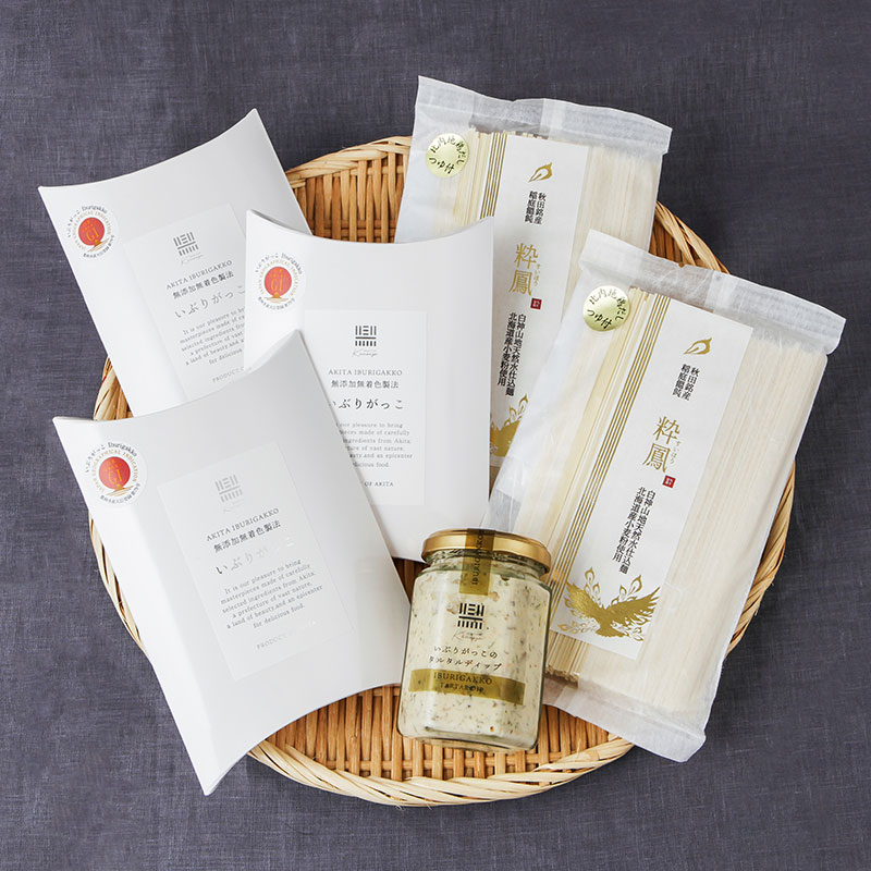 | 保存方法 | 【プレミアムなひとときにいぶりがっこ白箱ギフト】 直射日光、高温多湿を避けて保存して下さい。 【稲庭うどん「粋鳳」比内地鶏つゆセット】 直射日光及び多湿を避け常温で保存して下さい。 【いぶりがっこタルタルディップ】 開封後は冷蔵庫に保存し、お早目にお召し上がりください。 |