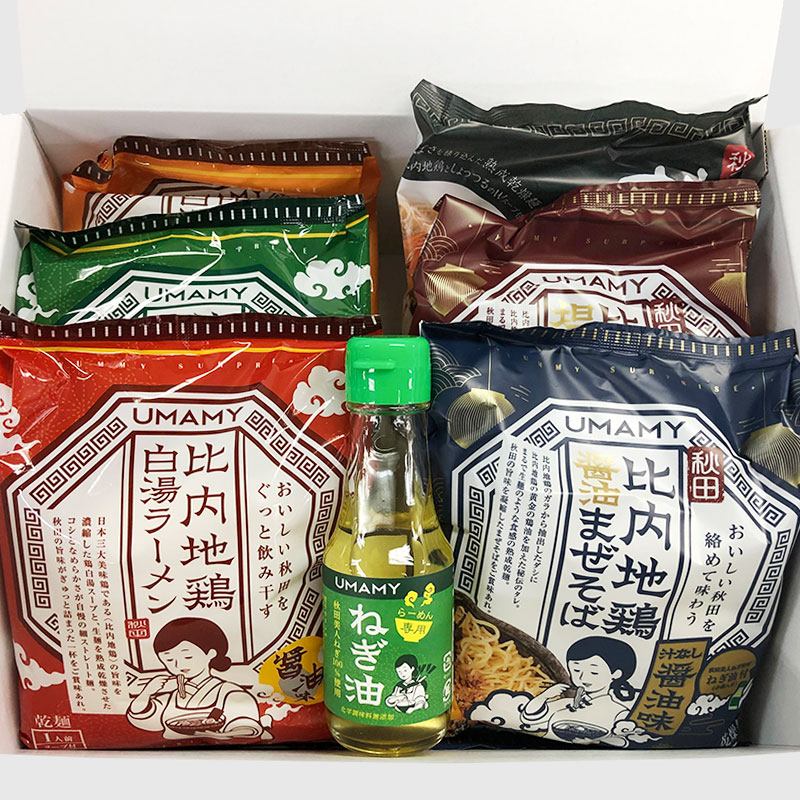 | 内容量 | 比内地鶏白湯ラーメン醤油味(1食入)、比内地鶏白湯ラーメン塩味(1食入)、比内地鶏白湯ラーメン味噌味(1食入)、比内地鶏醤油まぜそば(1食入)、比内地鶏坦々まぜそば(1食入)、ぎばさらーめん(1食入)、ねぎ油 各1個 |