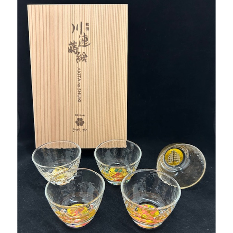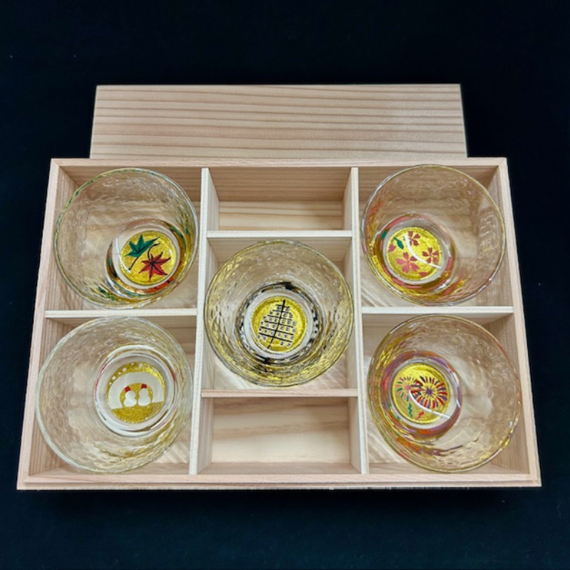 川連蒔絵グラス「秋田の四季」ぐい呑み5柄様(秋田杉箱入り)