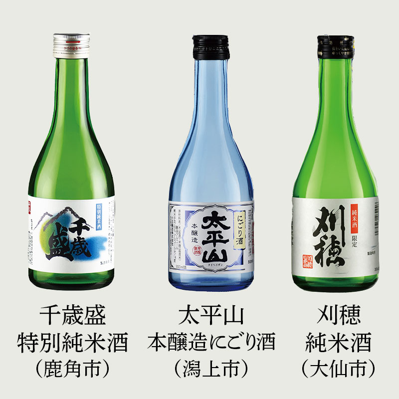 | 内容量 | ■千歳盛 特別純米酒 ■太平山 本醸造 にごり酒 ■刈穂 純米酒 ■大納川 純米 山内杜氏 ■福小町 辛口純米酒 各300ml×5本 |