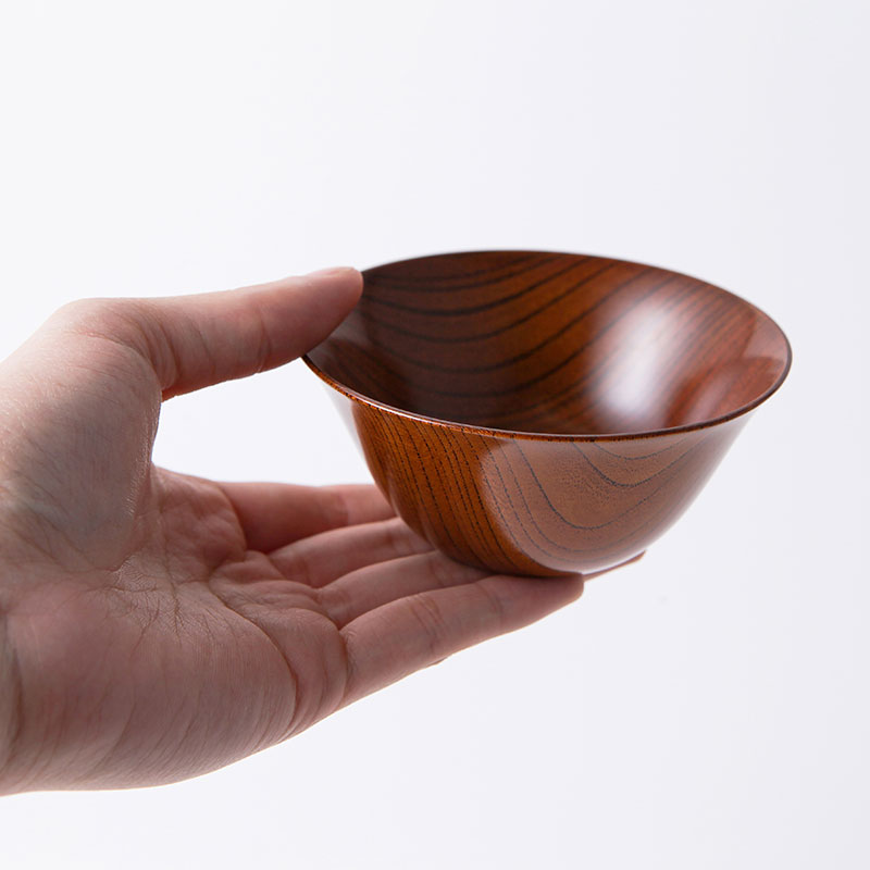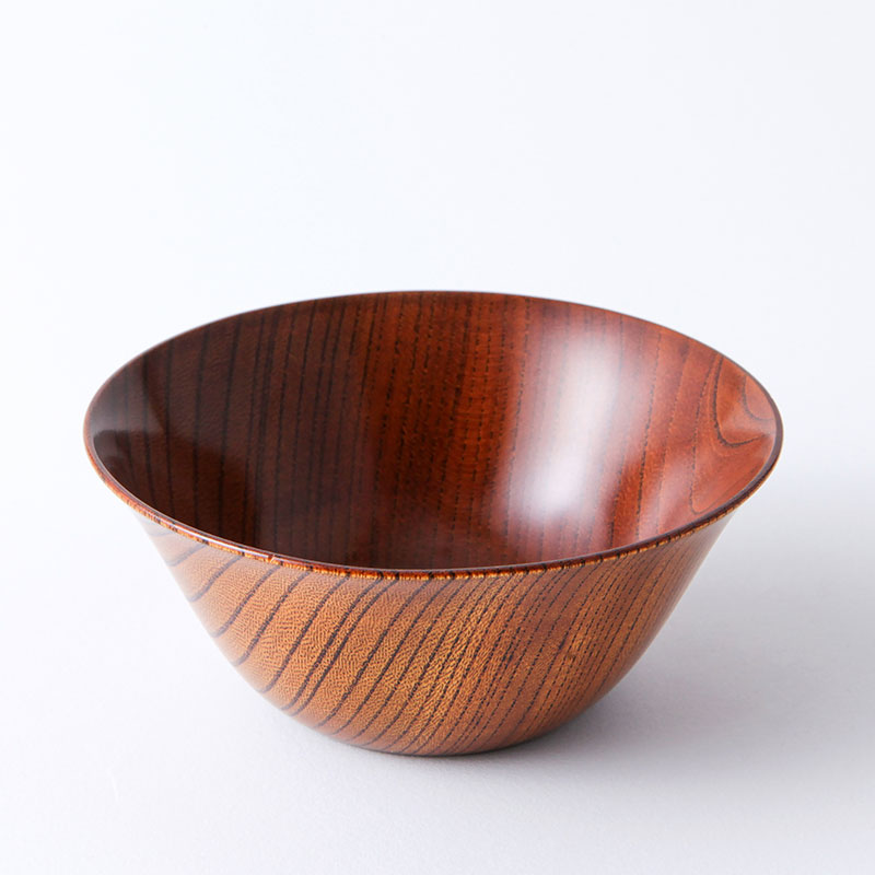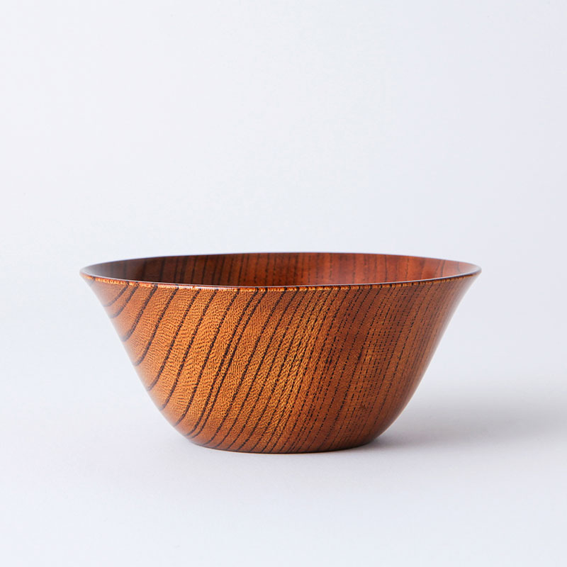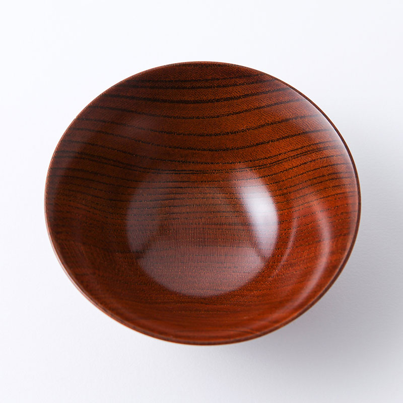 - ケヤキ材の挽物の木地に生漆を10回以上拭漆を重ね、木目の美しさを引き立たせています。