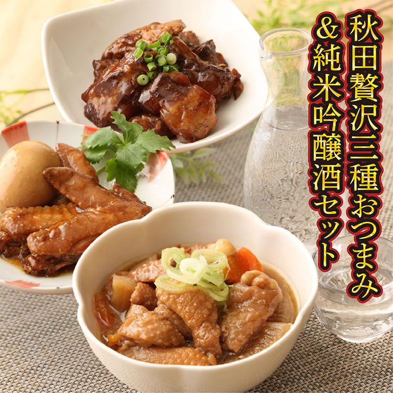 - 比内地鶏等を使用した秋田の贅沢おつまみ3種と、国際コンテストで受賞歴もある純米吟醸のセットです。
