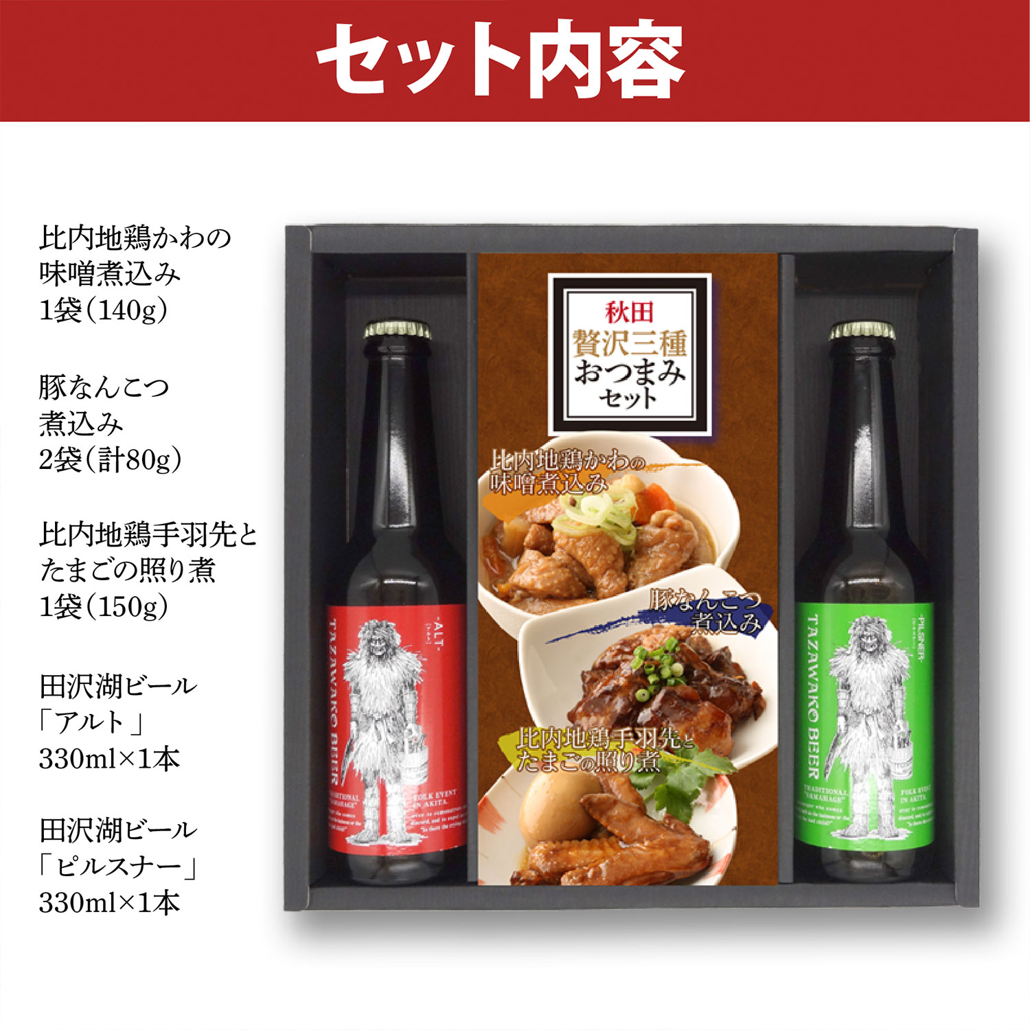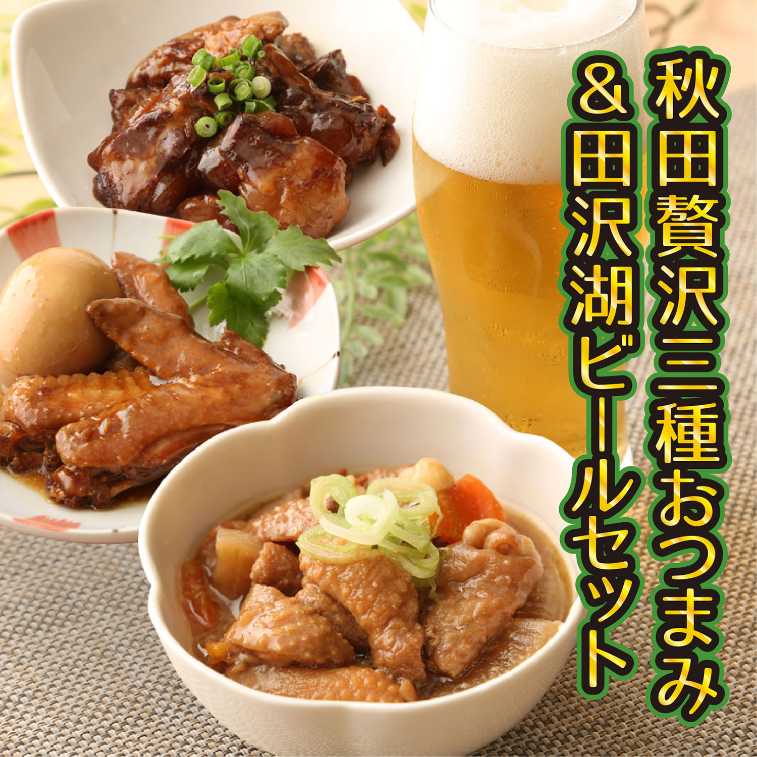 - 比内地鶏等を使用した秋田の贅沢おつまみ3種と、国際コンテストで受賞歴もある田沢湖ビール2種のセットです。