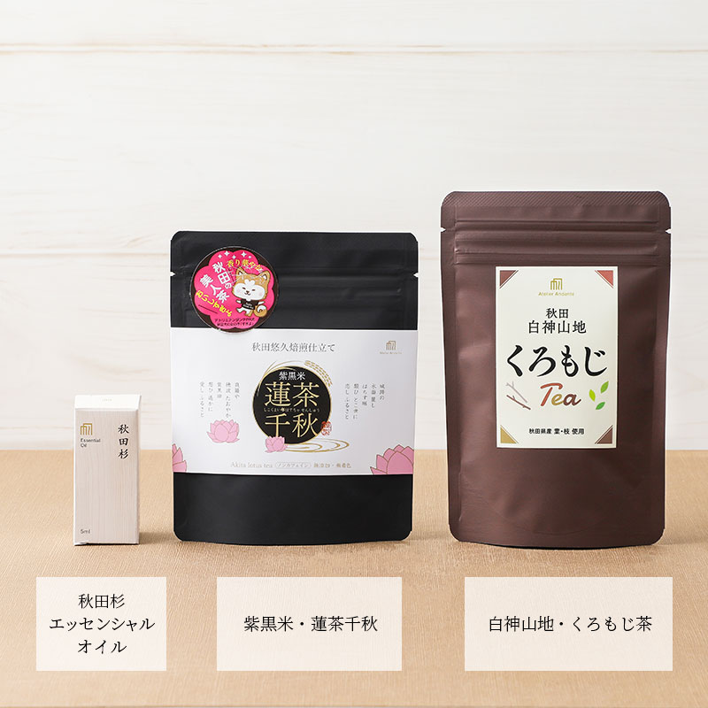 | 原材料 | くろもじ茶:くろもじ(白神山地産) 紫黒米・蓮茶千秋:古代米「紫黒米朝紫」(秋田市産)、蓮葉(国産) 秋田杉のエッセンシャルオイル:秋田杉葉 |