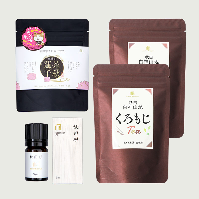 | 内容量 | ■白神山地のくろもじ茶(1袋8包入) 2袋 ■紫黒米・蓮茶千秋(6包入)1袋 ■秋田杉のエッセンシャルオイル(5ml)1本 |