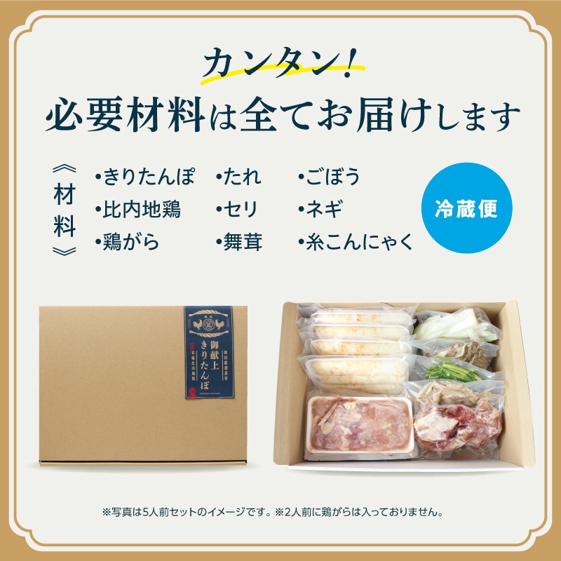| 内容量 | きりたんぽ640g(80g×8本)、たれ300g、ごぼう70g、比内地鶏肉250g、せり80g、ねぎ190g、鶏がら200g、舞茸90g、糸こんにゃく170g |
