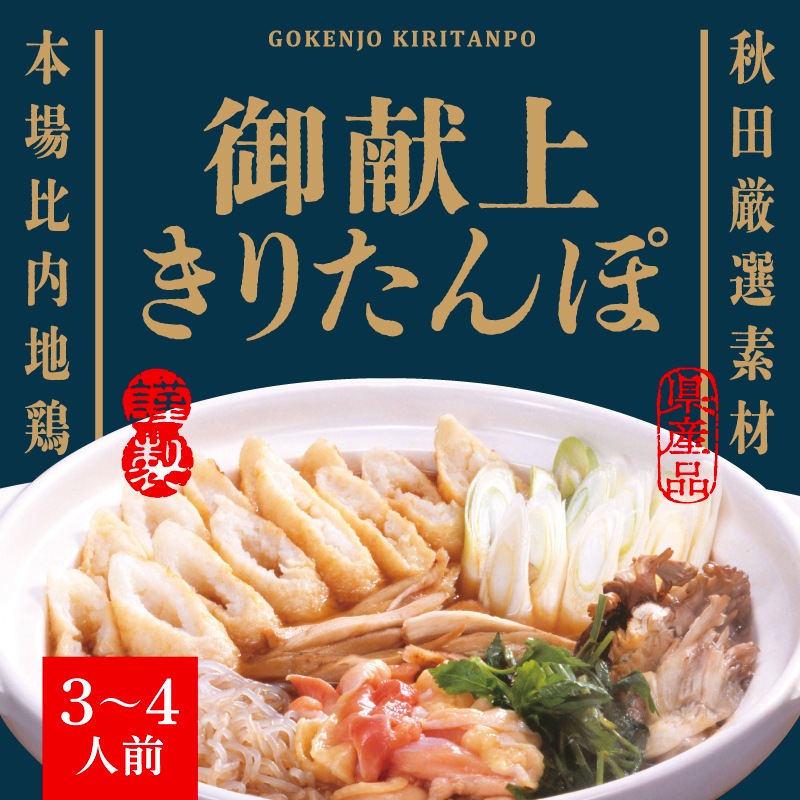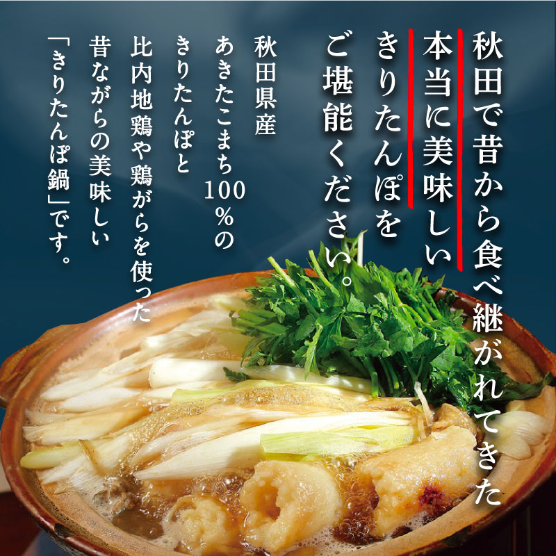 | 原材料 | きりたんぽ:うるち米(秋田県産あきたこまち) たれ:醤油(小麦・大豆を含む、秋田県製造)、鶏がらスープ、ポークエキス、食塩、かつおぶしエキス、チキンオイル/調味料(アミノ酸等) 糸こんにゃく:こんにゃく粉/水酸化カルシウム 他具材:鶏肉、鶏がら、ねぎ、舞茸、せり、ごぼう ※原材料の鶏肉は比内地鶏を使用 |