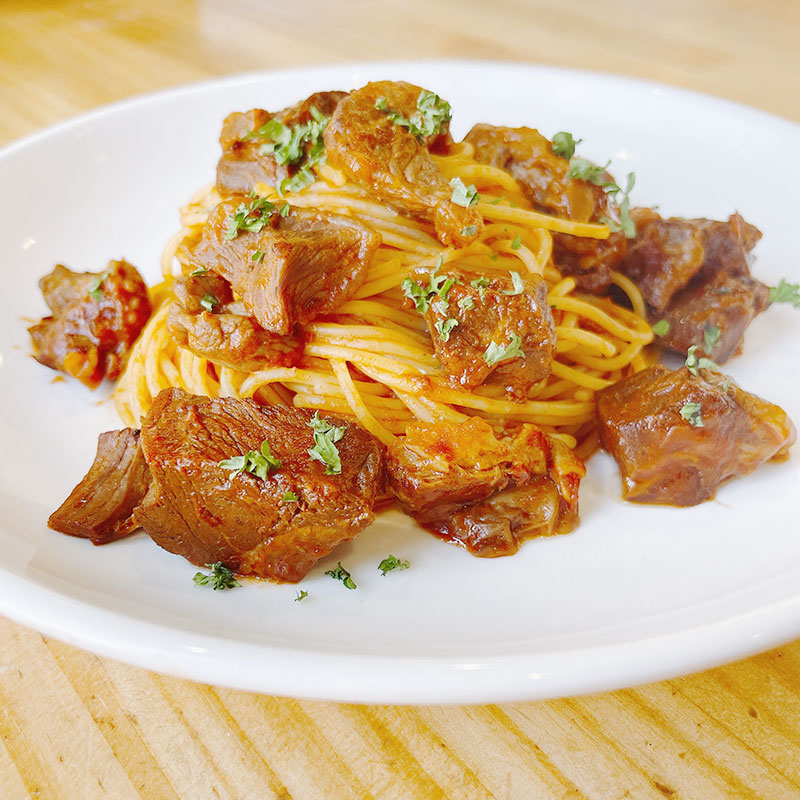 - 特製のナポリタンソースに、旨味が強く、口どけの良い脂の秋田牛を赤ワインで煮込み贅沢に加えました。
