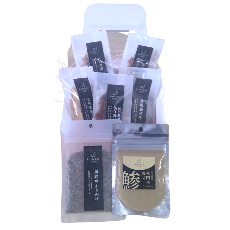 | 規格 | 比内ささみ:10g むね肉:10g もも肉:10g 和牛:10g 笑子豚:10g 黒納豆ふりかけ:20g アジふりかけ:20g |