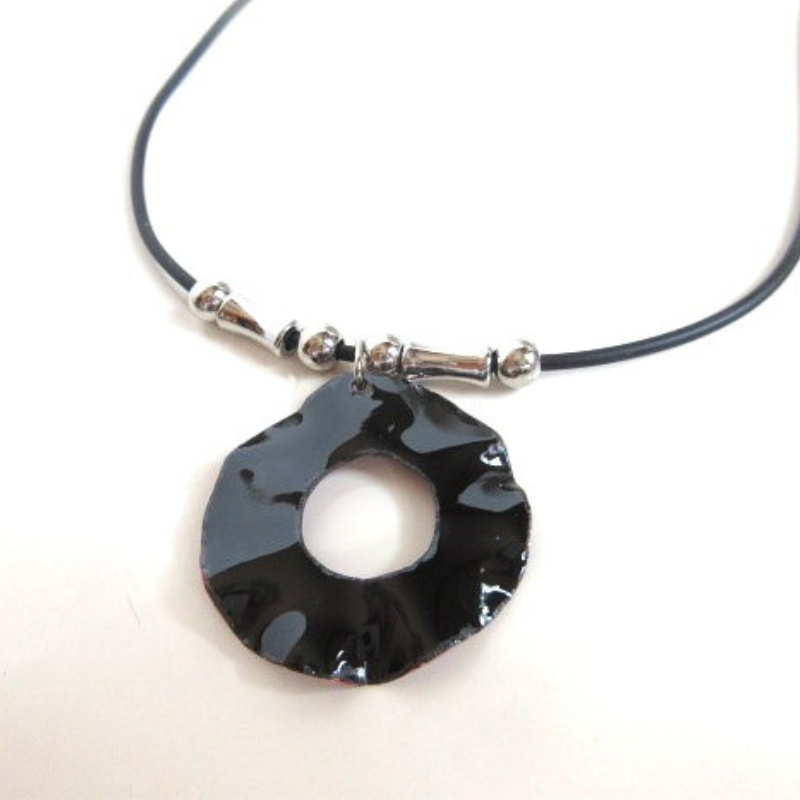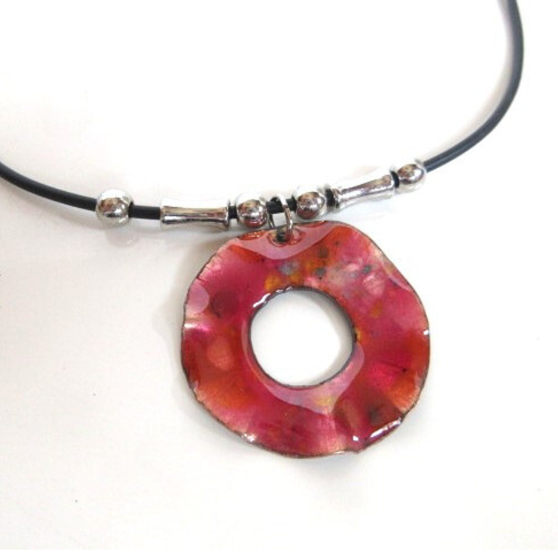 - 銅版を切り彫金し、赤系の釉薬を乗せ焼成したネックレスです。