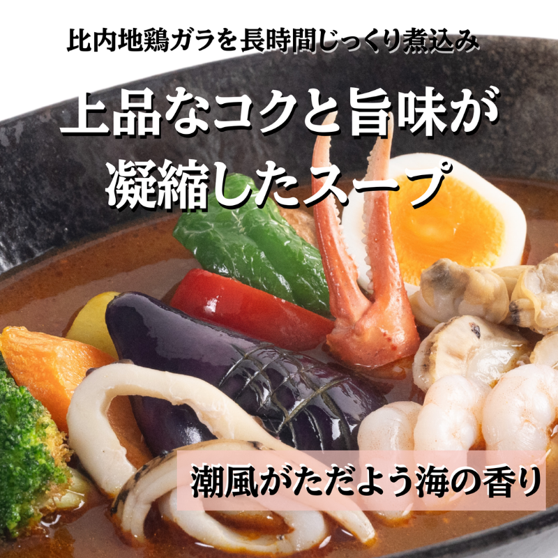 比内地鶏ガラをじっくり煮込んだ濃厚スープに、カニ爪、イカ、ホタテ貝柱、あさりなどの海の幸をたっぷりと加えた贅沢なスープカレーです。