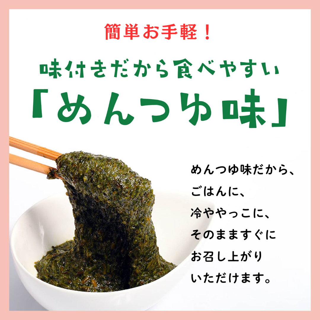 | 原材料 | 海藻アカモク(秋田県産)、つゆ(しょうゆ、砂糖、食塩、かつおぶし、こんぶ)/調味料(アミノ酸等)、酸味料、(一部に小麦・大豆を含む) |