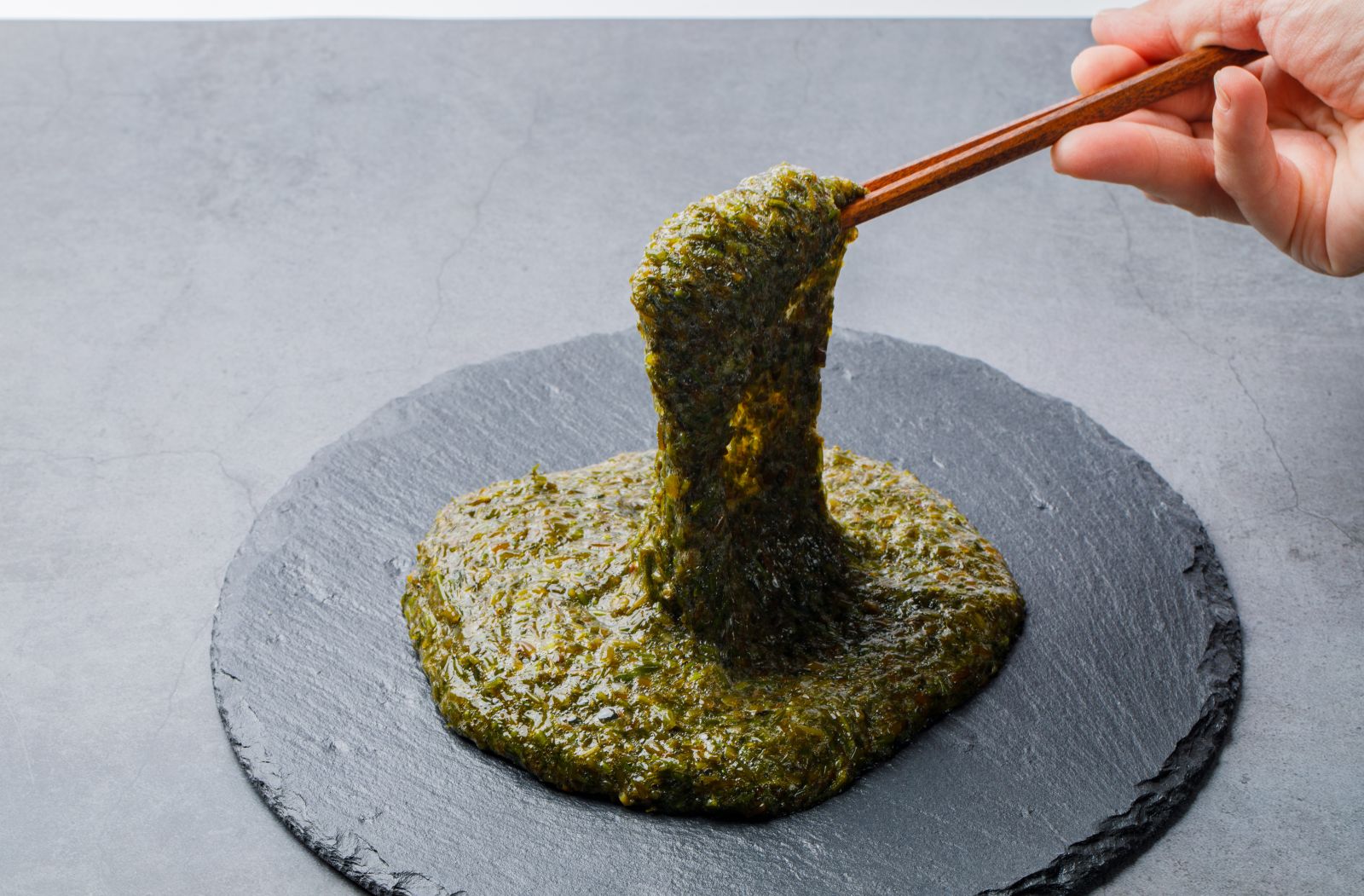 あかもくという名前のとおり、生の状態では赤褐色で、湯掻くことで鮮やかな緑色になり、細かく刻むことで強い粘りを引き出します。箸で持ち上げるとひとかたまりで持ち上がるくらいの強力な粘り気で、その正体は「フコイダン」といわれる食物繊維です。